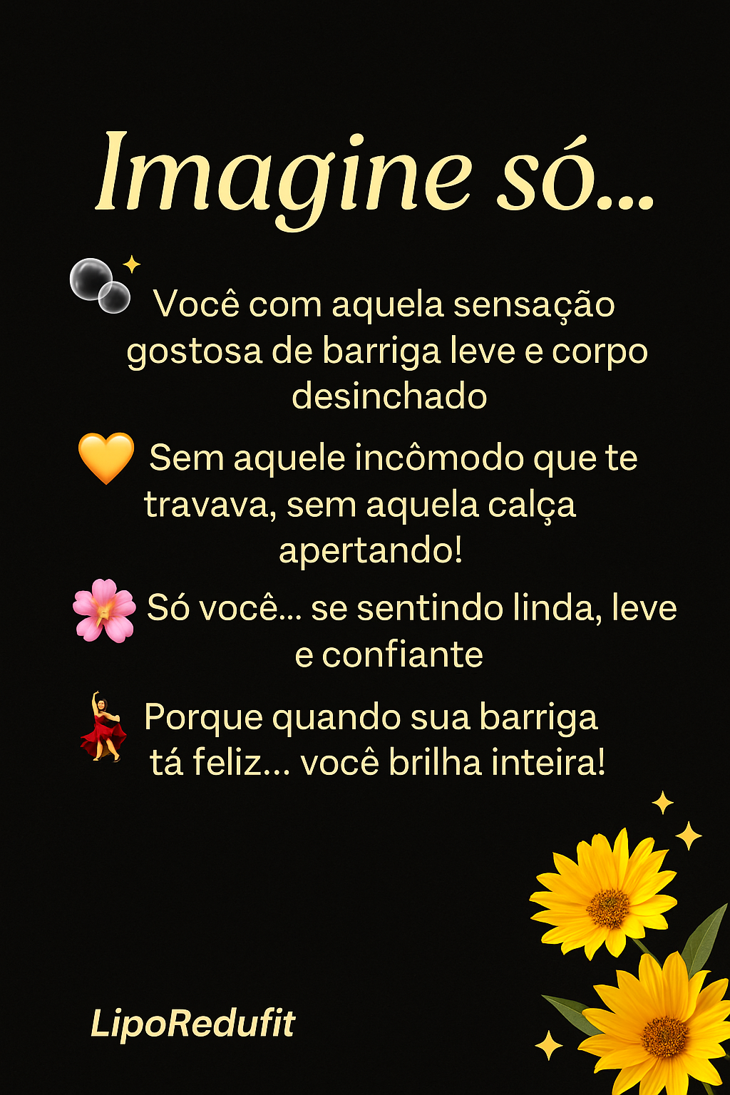 “Eu nunca acreditei que seria possível eliminar o inchaço, estufamento e conquistar uma barriga lisinha tão rápido! O Lipo Redufit mudou minha vida, e agora eu estou pronta para qualquer biquíni.”
